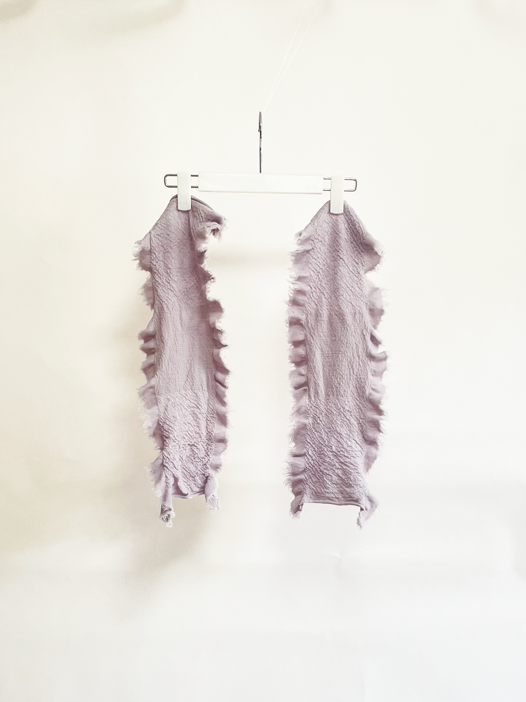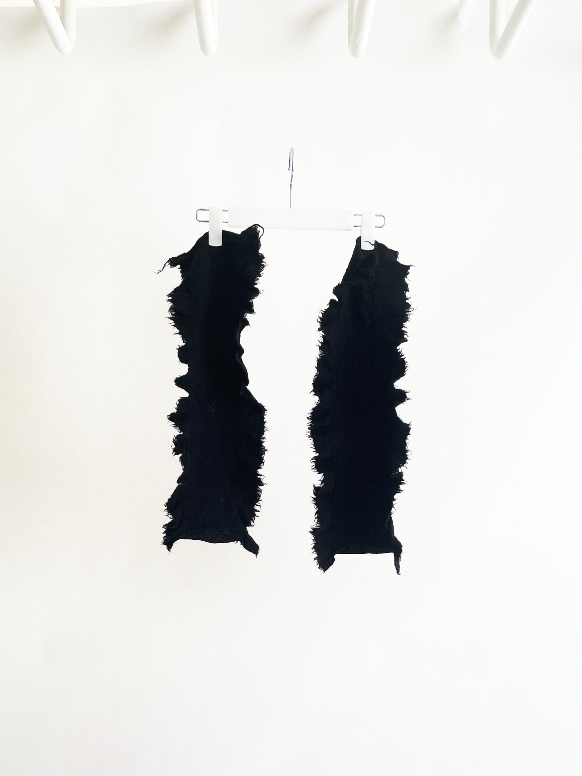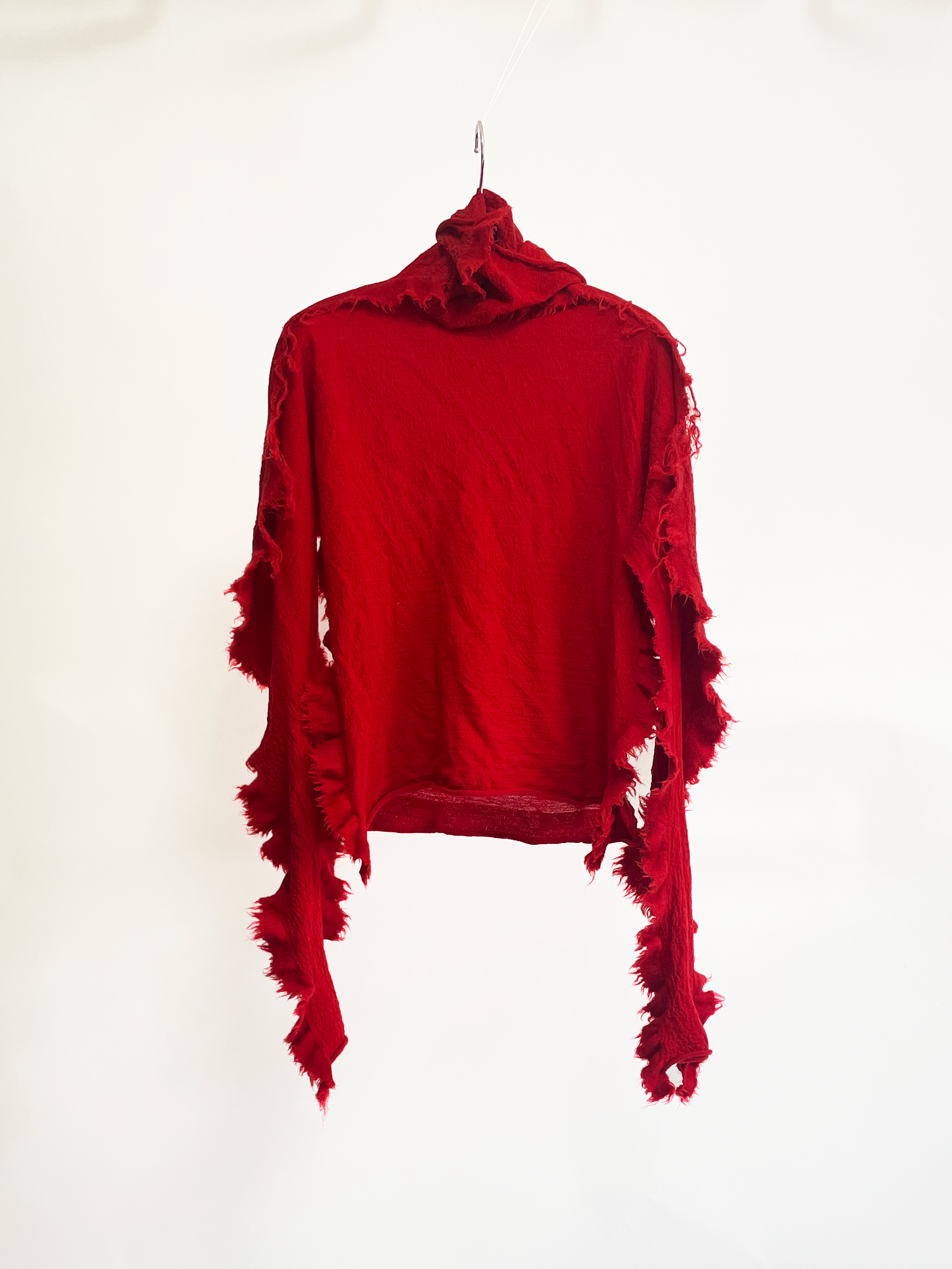 ダブルジャガード機で編んだウールジャージ。一枚のニット生地をカットアウトし、ウールの特性を活かした、縮絨加工を施した無縫製のタートルネック&アームウォーマー